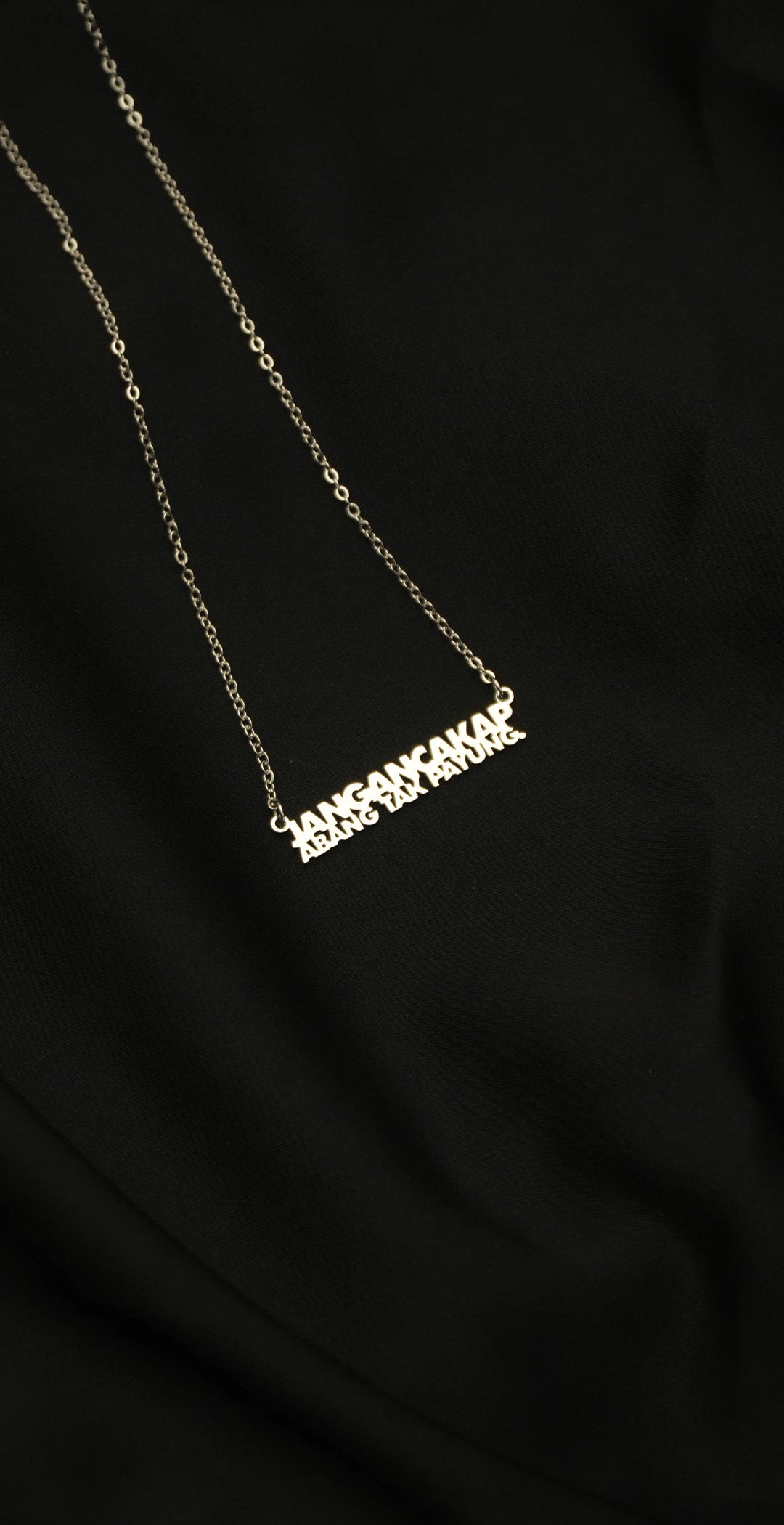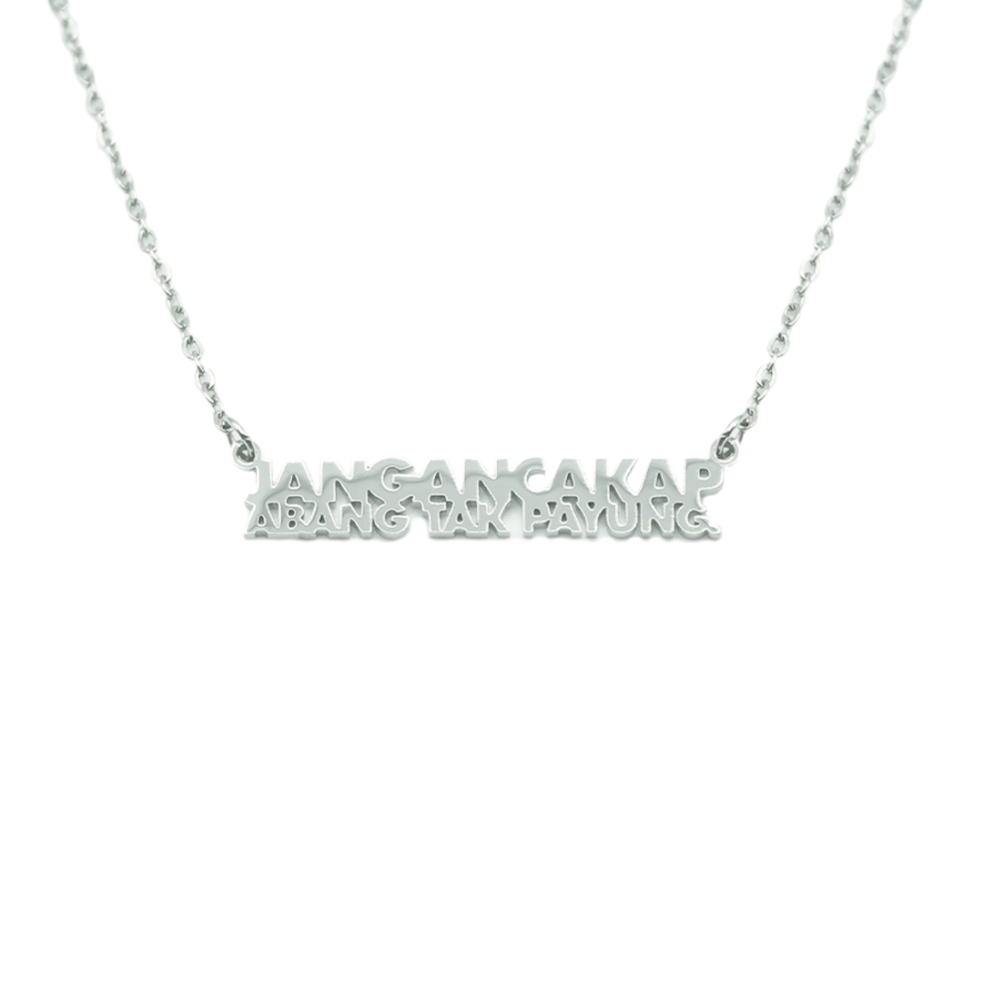 Introducing the Jangan Cakap Abang Tak Payung Necklace. Made from high-quality stainless steel, paired with a rope chain. A familiar phrase, now designed to be worn close to the heart.